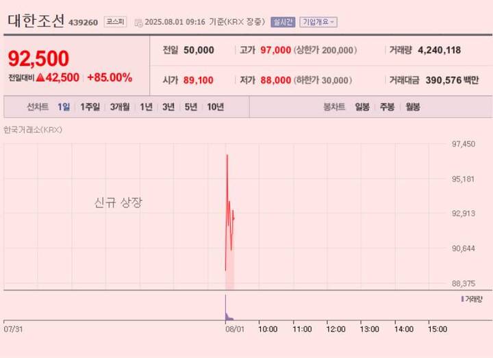 | 2025년 8월 1일 | 코스피 상장 첫날, 공모가 5만원 대비 80% 이상 급등, 9만원대 마감 (장중 최고 9만9400원) | 증권 시장 데이터 |