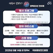 특히 지난해의 논란을 극복하고 국민적 화합을 도모하려는 주최 측의 의지가 반영되어 더욱 풍성하고 의미 있는 행사들이 될 것으로 기대됩니다. 이번 광복 80주년이 과거의 역사를 기억하고 미래를 향한 희망을 다지는 진정한 화합의 장이 되기를 진심으로 바랍니다. 여러분도 꼭 참여하셔서 그 감동을 함께 느껴보시길 추천합니다! 다음에도 더 알찬 연예계 소식으로 찾아올게요. 그때까지 건강하세요!